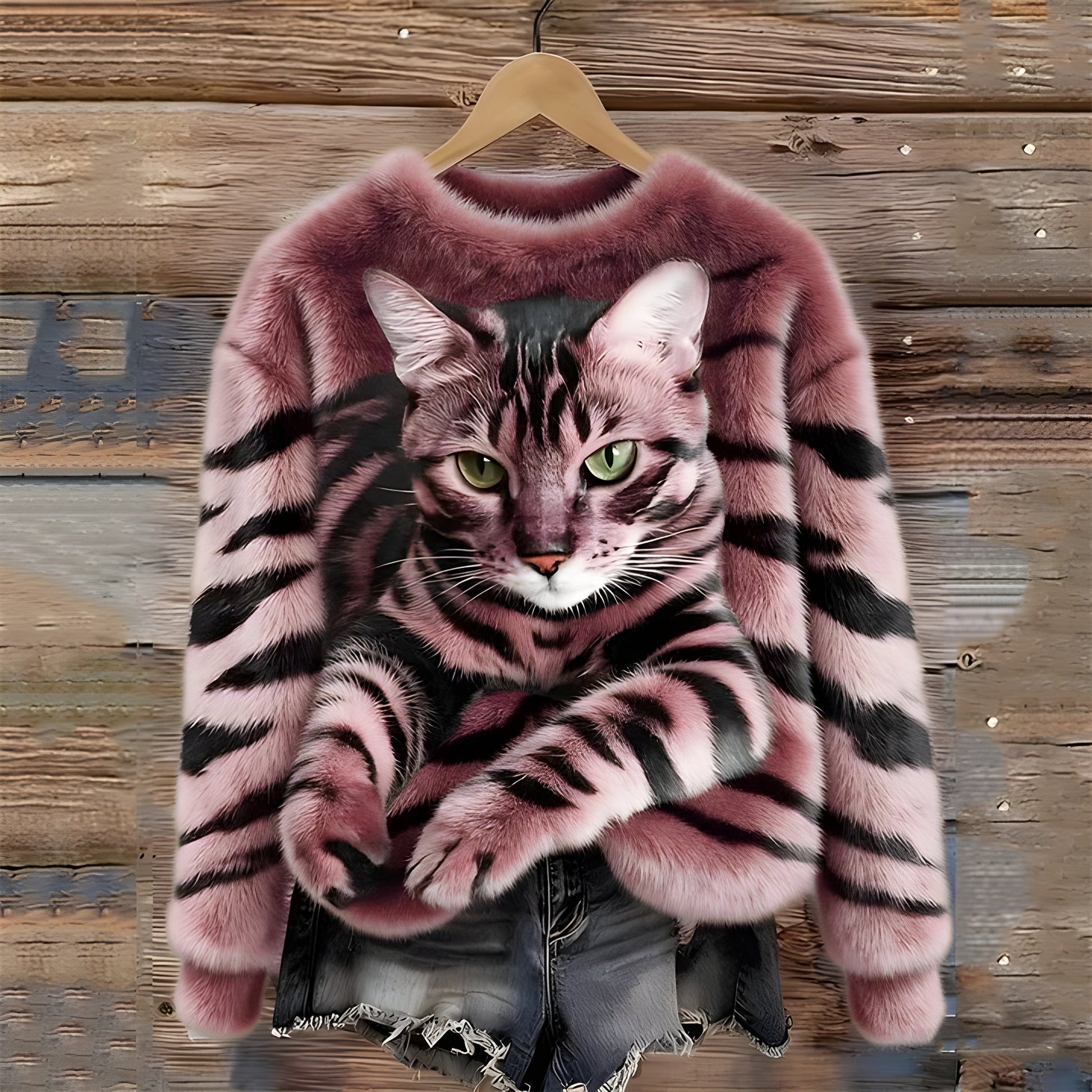The unique combination of a cat print with tiger accents makes this sweater stand out, while still being easy to wear.